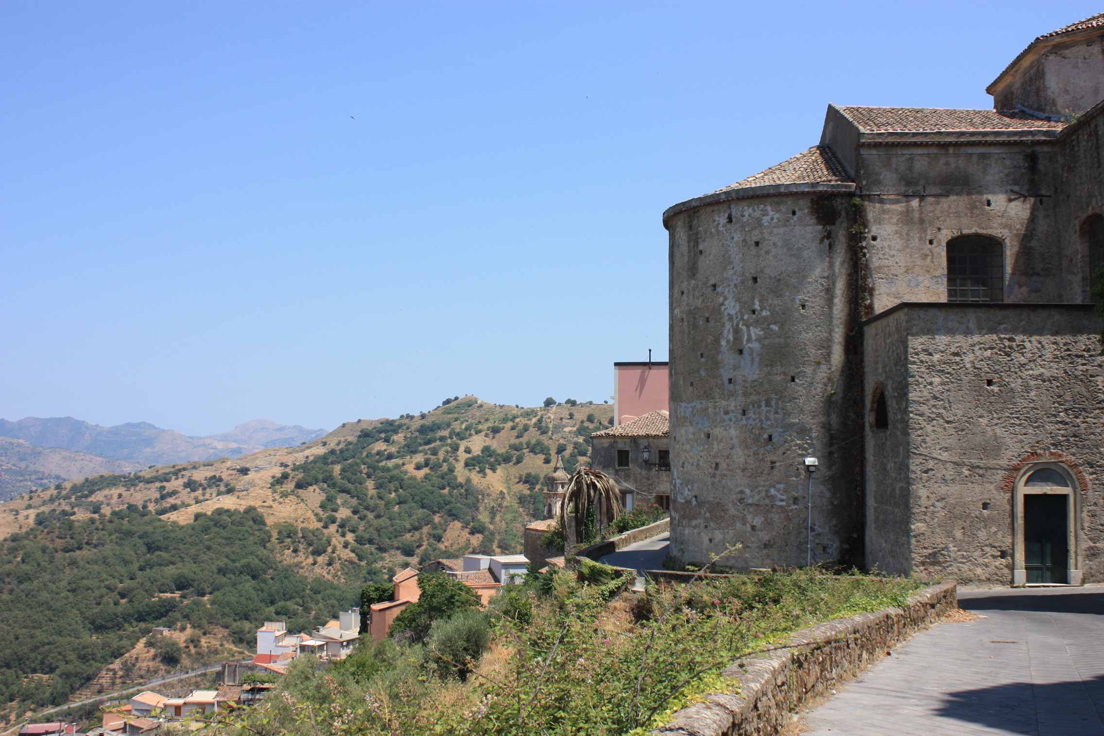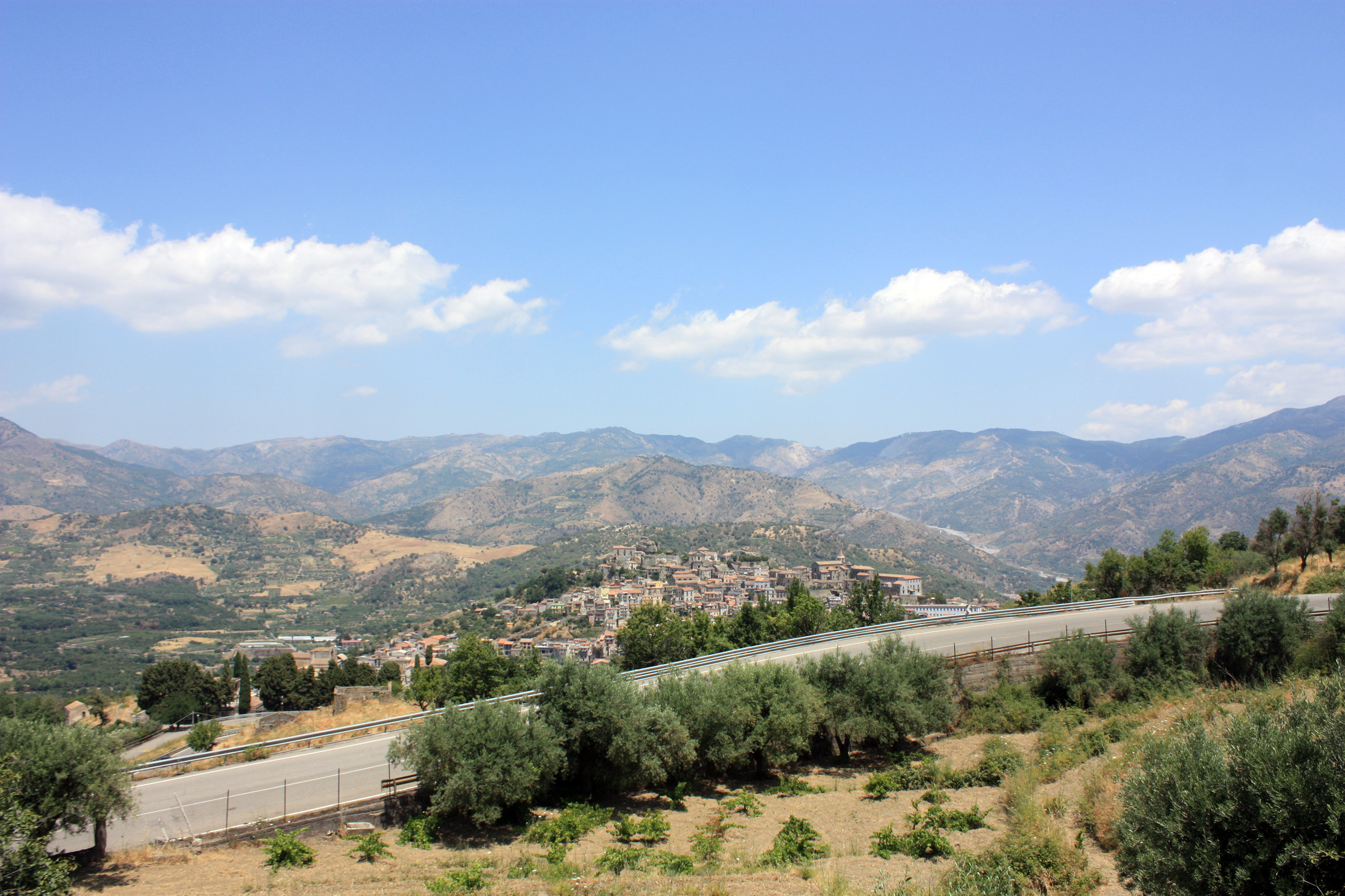 Travelling friend and I set off in search of the Alcantara Gorge, driving through Piedmonte Etneo and Linguaglossa, climbing higher and weaving among olive, peach and almond groves. Our plan was a stop at Castiglione, the gateway to the Alcantara Range, and here it is on the other side of the valley from our zigzag road, with the mountains in the background.