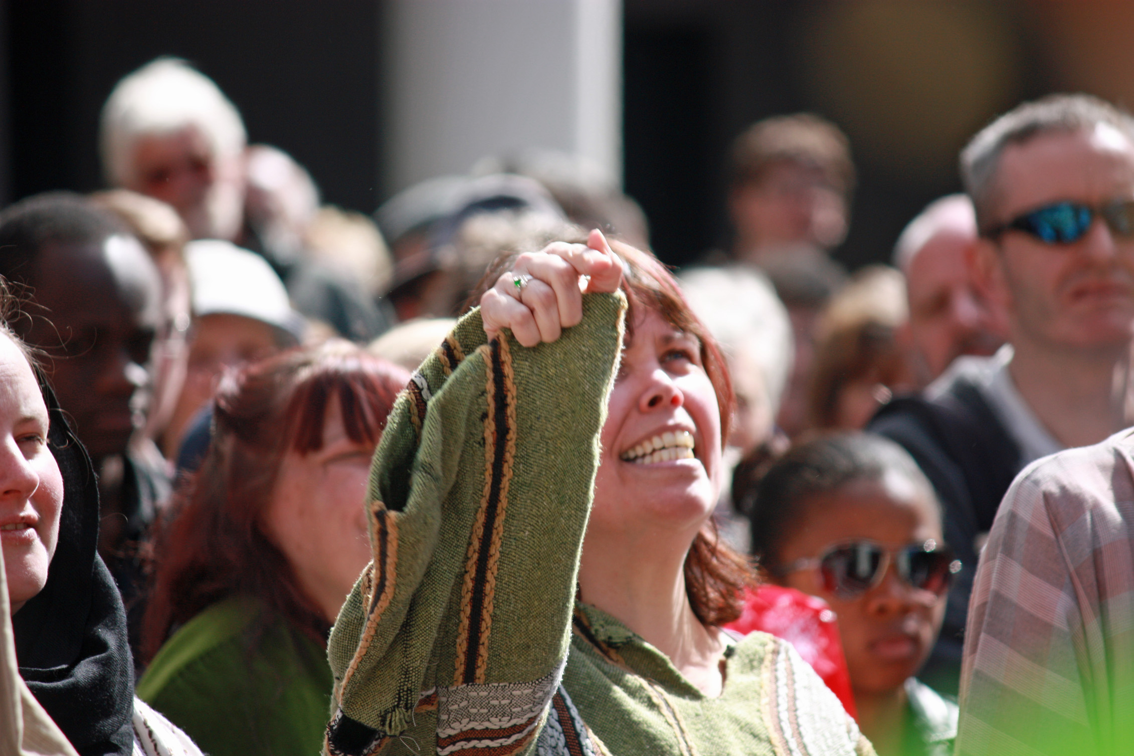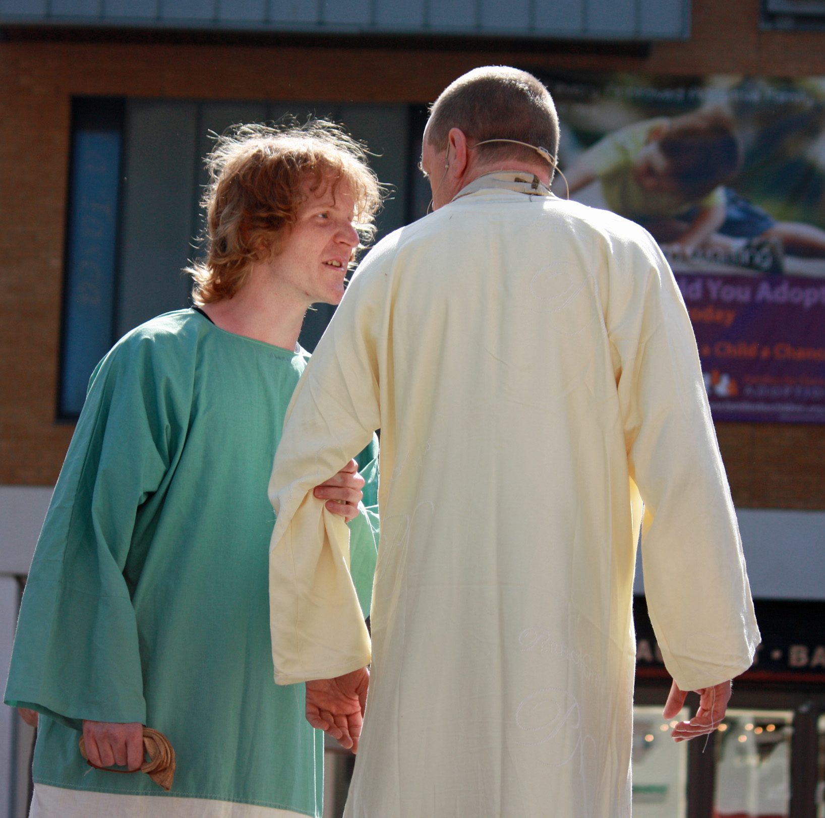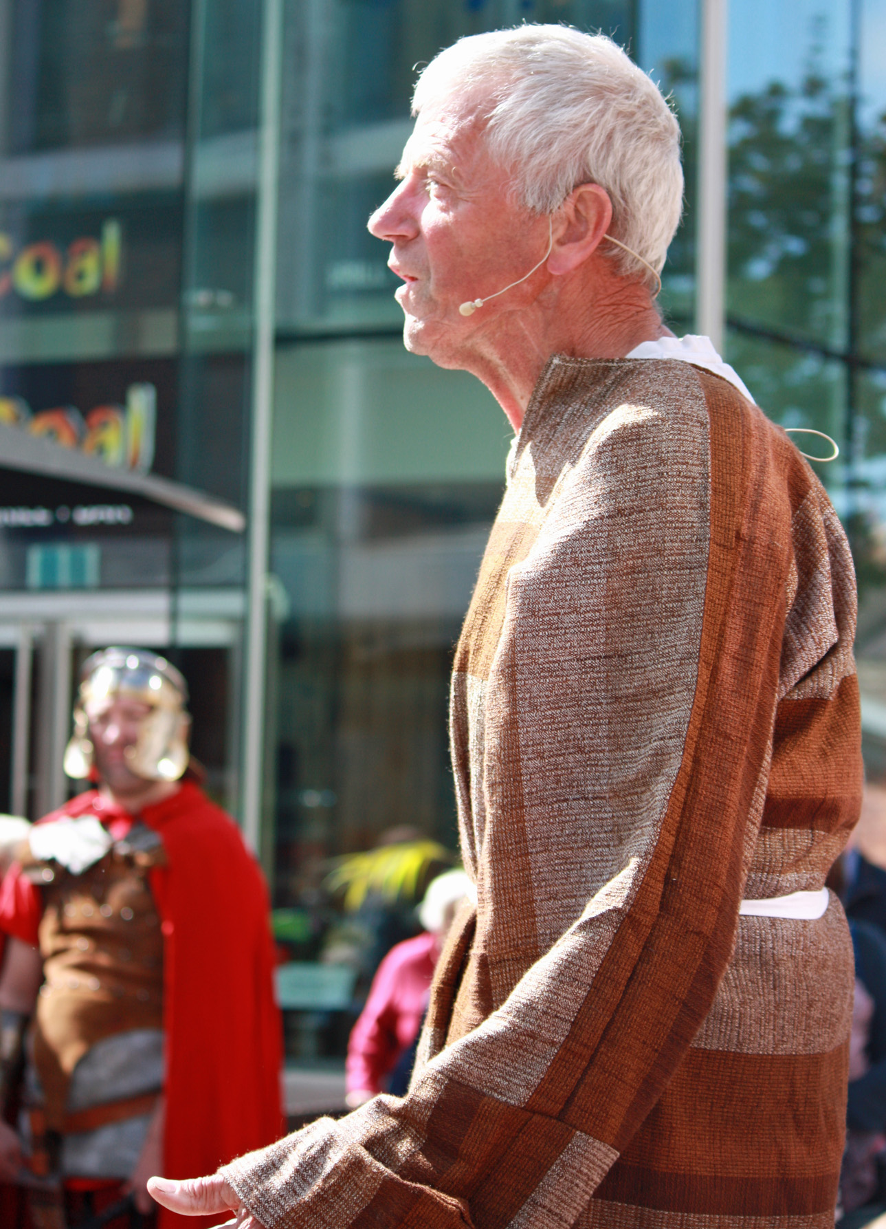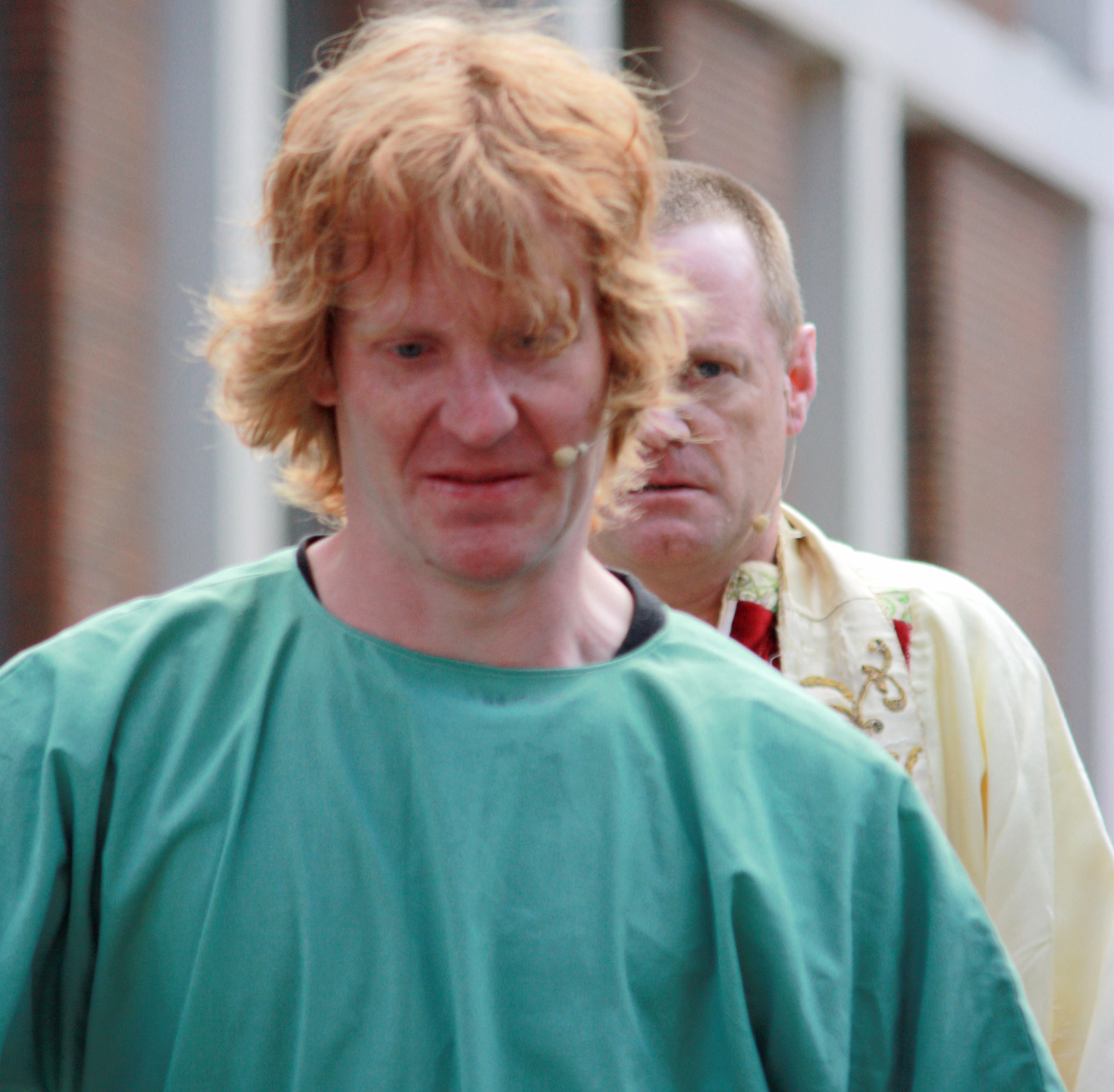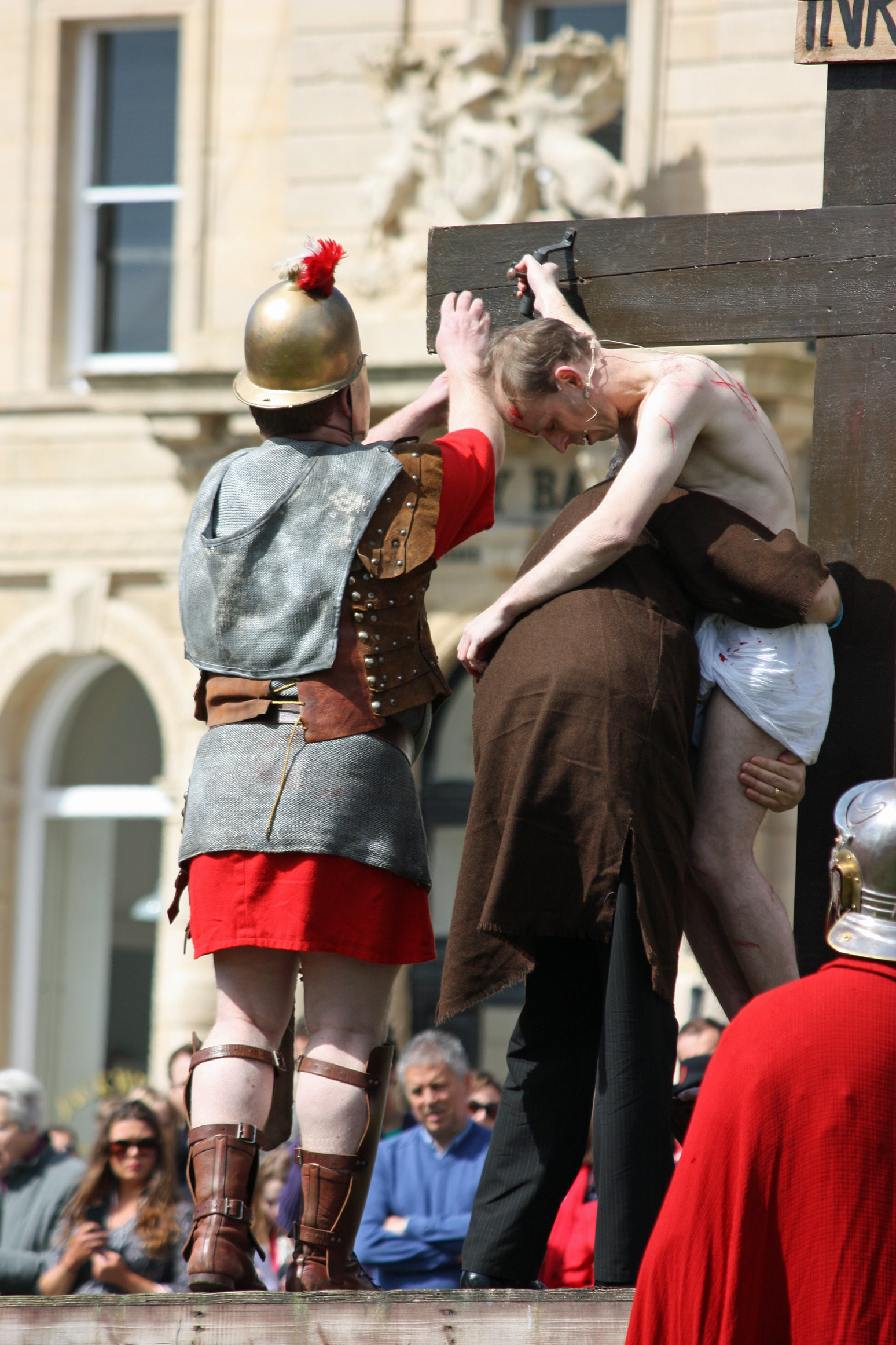 Earlier in the week I learnt that Exeter was staging The Passion in the streets today, so camera armed I went to see the event. It began with a service in the Cathedral and a procession through the town. I found it in Bedford Square and got a space close to the front of a big crowd of people.