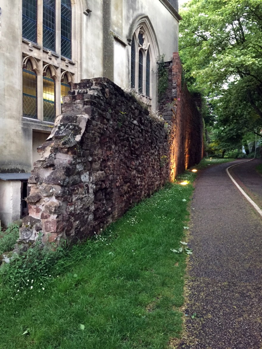 Parts of Exeter’s city wall is nearly 2000 years old, built in Roman times and nearly 70 % of it still exists. Through the centuries it has been repaired and added to many times. This section of the wall is close to where the Southgate would have been.There is archaeological evidence that the gate would have had two towers, being the area of the city most vulnerable to attack, because of its proximity to the river.