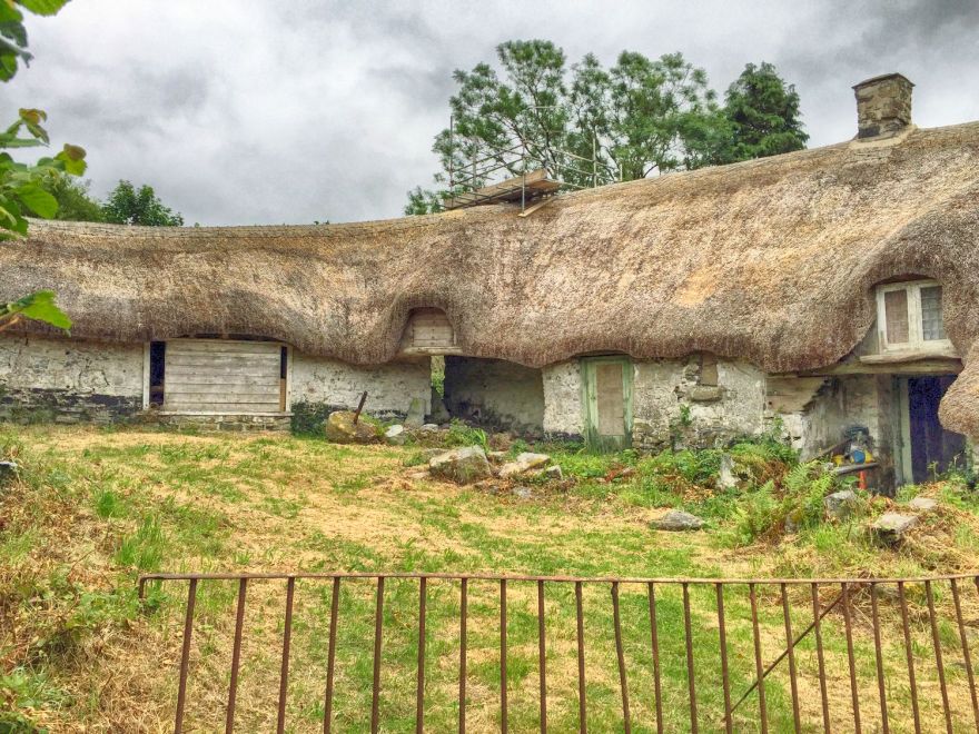 Over to the west of Dartmoor a thatched cottage is growing out of the earth, or perhaps it’s sliding into the earth. Built in the 17th century this curved house has a passage through the middle, which might have been a division between house and livestock originally. It was the old post office for a period, and although it looks abandoned, there are also signs of work being done and the thatch seems to be in good condition. I hope it’s restored to it’s former glory, that would cost an awful lot of money.
