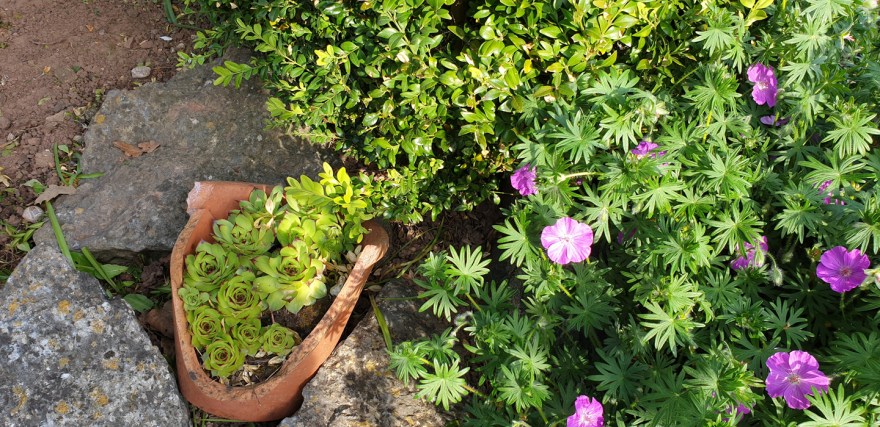 House leeks and hardy geraniums are such generous plants, they haven’t minded being ignored.