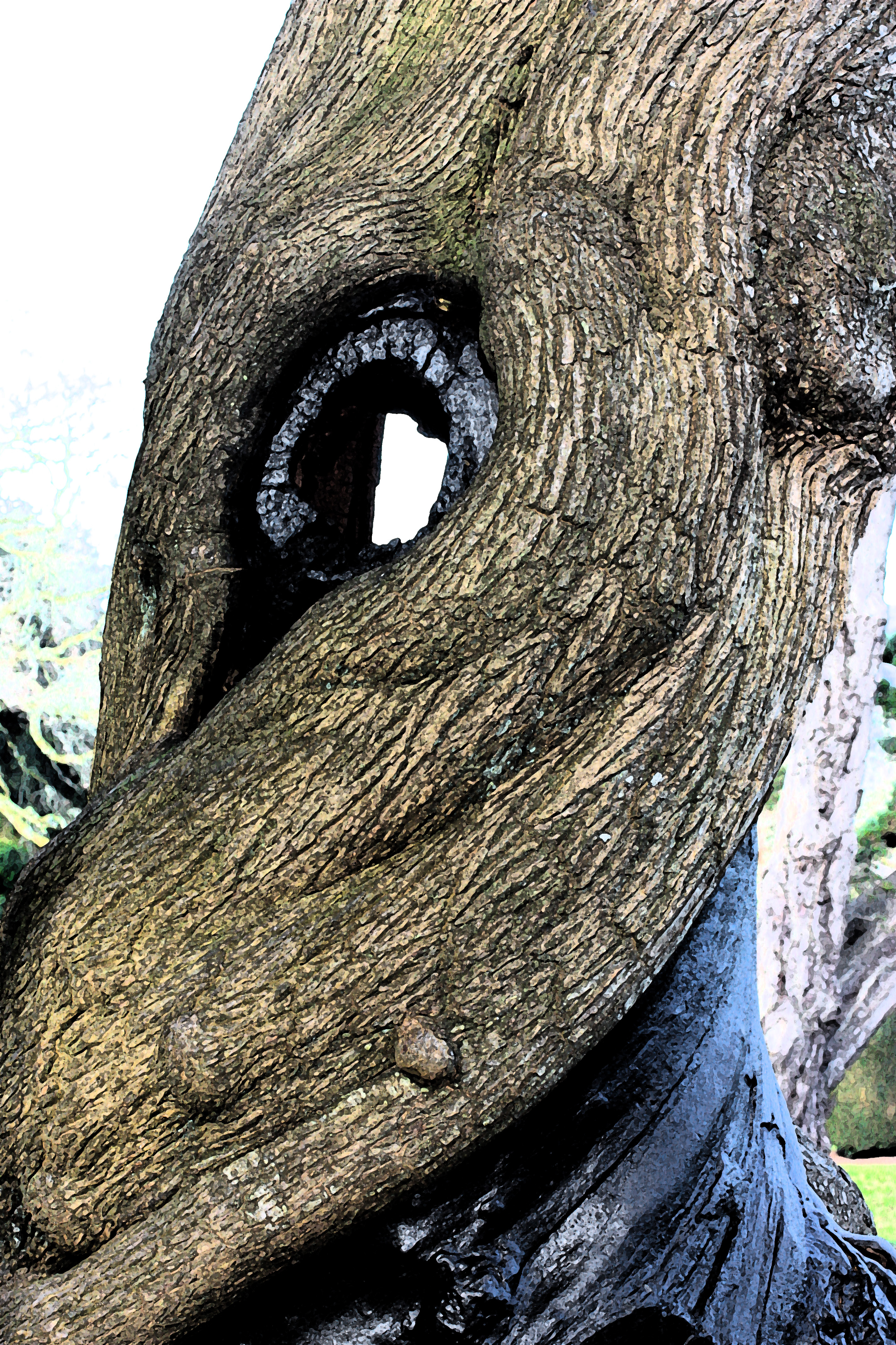 As soon as I saw this weeks challenge I remembered this photo, taken in the ground of Dartington Hall in Devon. I believe the large and very old tree was struck by lightning and that the dark stuff is applied to protect its insides. It seems to have saved it thank goodness, because it’s in a row and it would be a huge loss. As well as its own twists and turns I have fresco’d it with Photoshop.