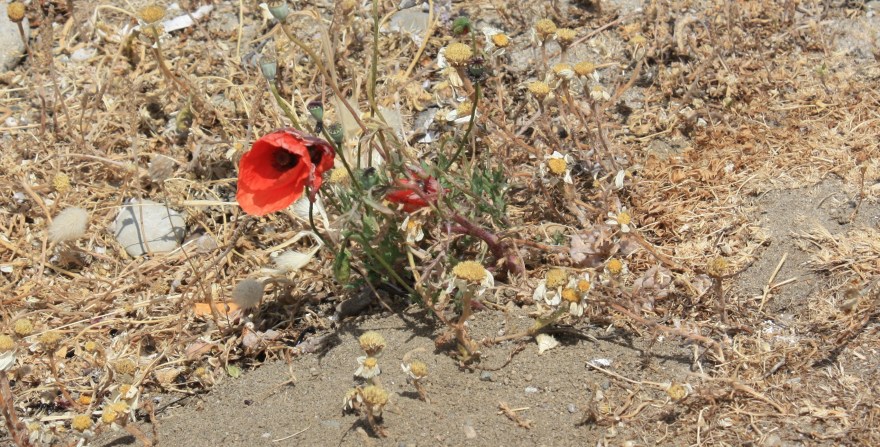A single satin poppy like a drop of blood on innocent sand.