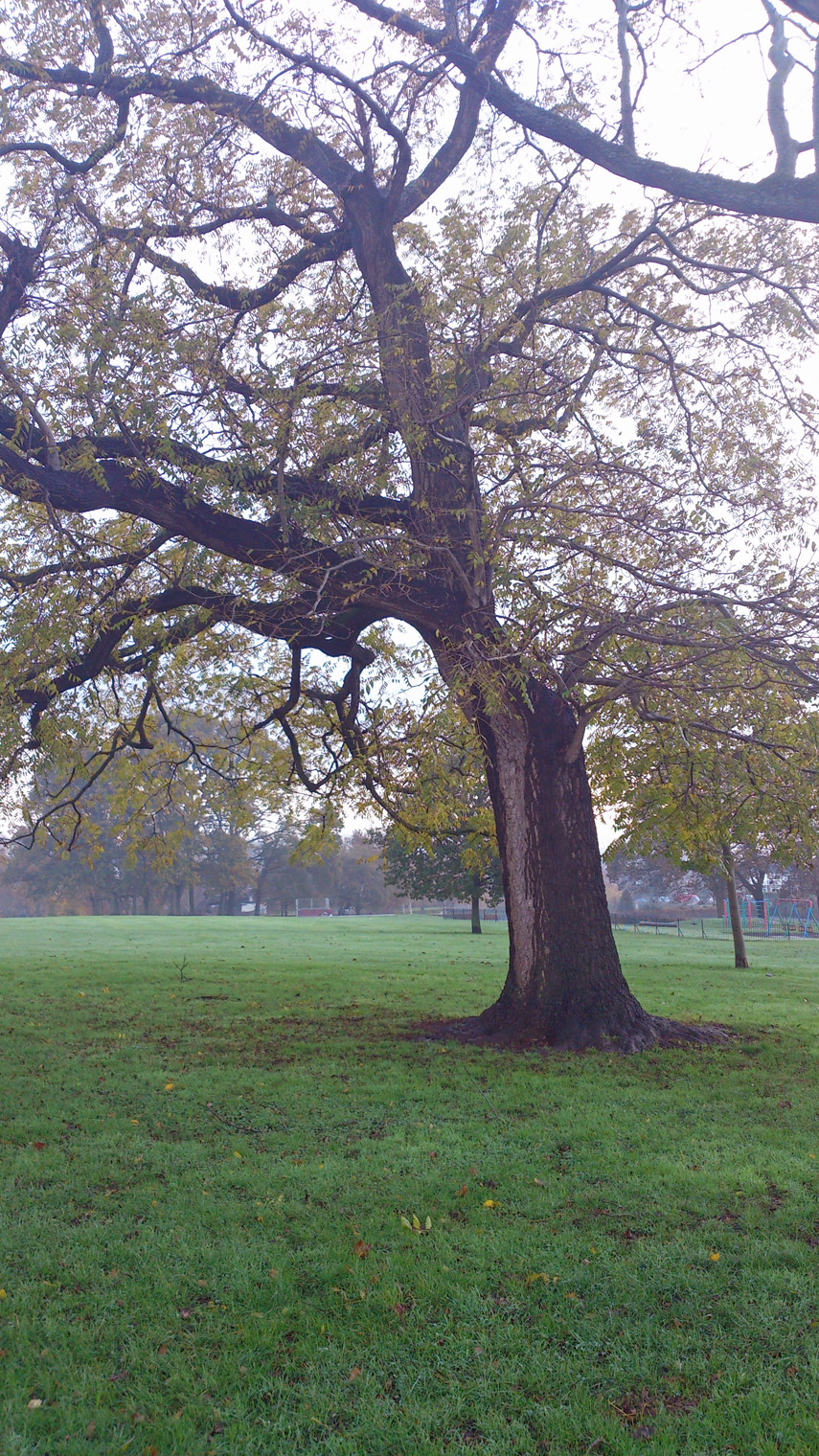A couple of years later the council planted a small grove of birch, carefully fenced off to protect them at first. They have now grown to maturity and are a lovely sight. So yesterday I walked Dido and Daisy, the border terriers early in the morning, before the November fog had cleared. They chased the squirrels – futilely of course, and I only had my phone camera but I had to share the young trees with you.