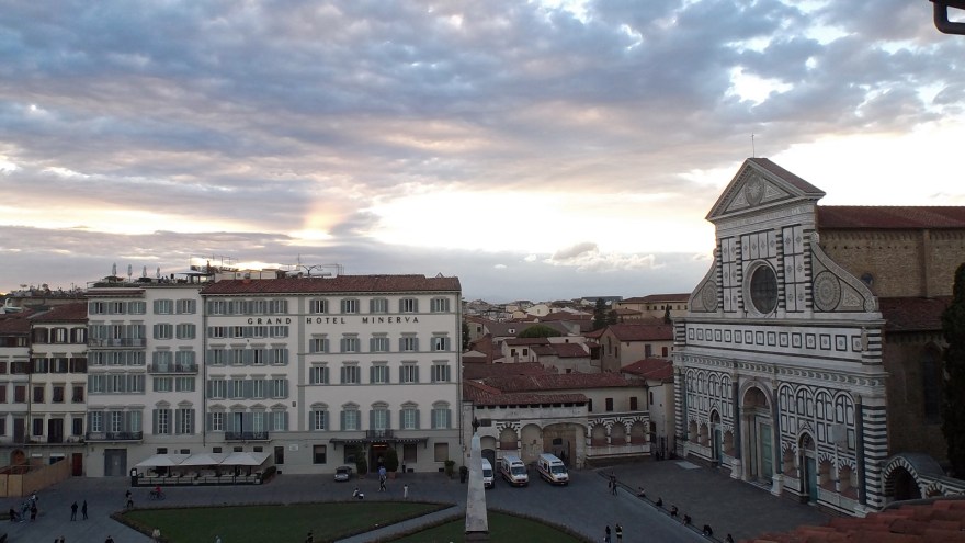 railway station in Florence gets its name from the church just around the corner from it, and it’s where I arrived for a week in that lovely city. I took this early evening photo from my room on the fourth floor of the Rosso 23, looking at the Piazza Santa Maria Novella.