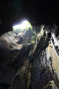I fought the urge to run back out but, spotting an older woman ahead of me inappropriately dressed in smart delicate sandals, I resolved that if she could do it so could I. The rickety boards were slimy, but both top and sides of the handrail were covered in a mix of guano and the date sized roaches. I struggled to maintain my balance with nothing to hold. Don’t cry Gilly, don’t make a fool of yourself, there are people further in the caves that are here every day. Khaled reached for my arm to stop me slipping into the mire. Instead of focussing on the five inch long queen roach that’s closer to my left ear than my pounding heart, I start to look around. The view up a hundred metres towards the cave roof was glorious with shafts of light illuminating what looked like a torn string vest with toy Star Wars figures tangled in it. Squinting, I realised that it’s the nest collectors scrambling on ladders made of rattan and rope that I could just about see in the distance.