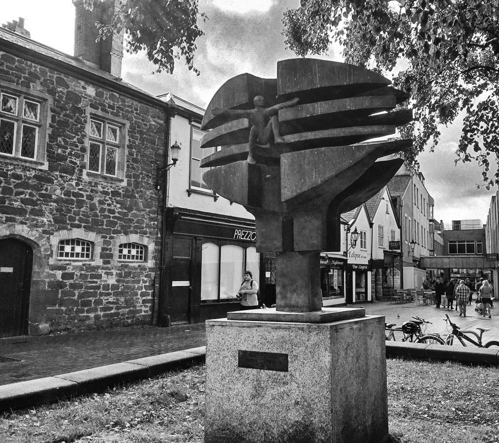 On the High Street and the Exeter Riddle sculpture.