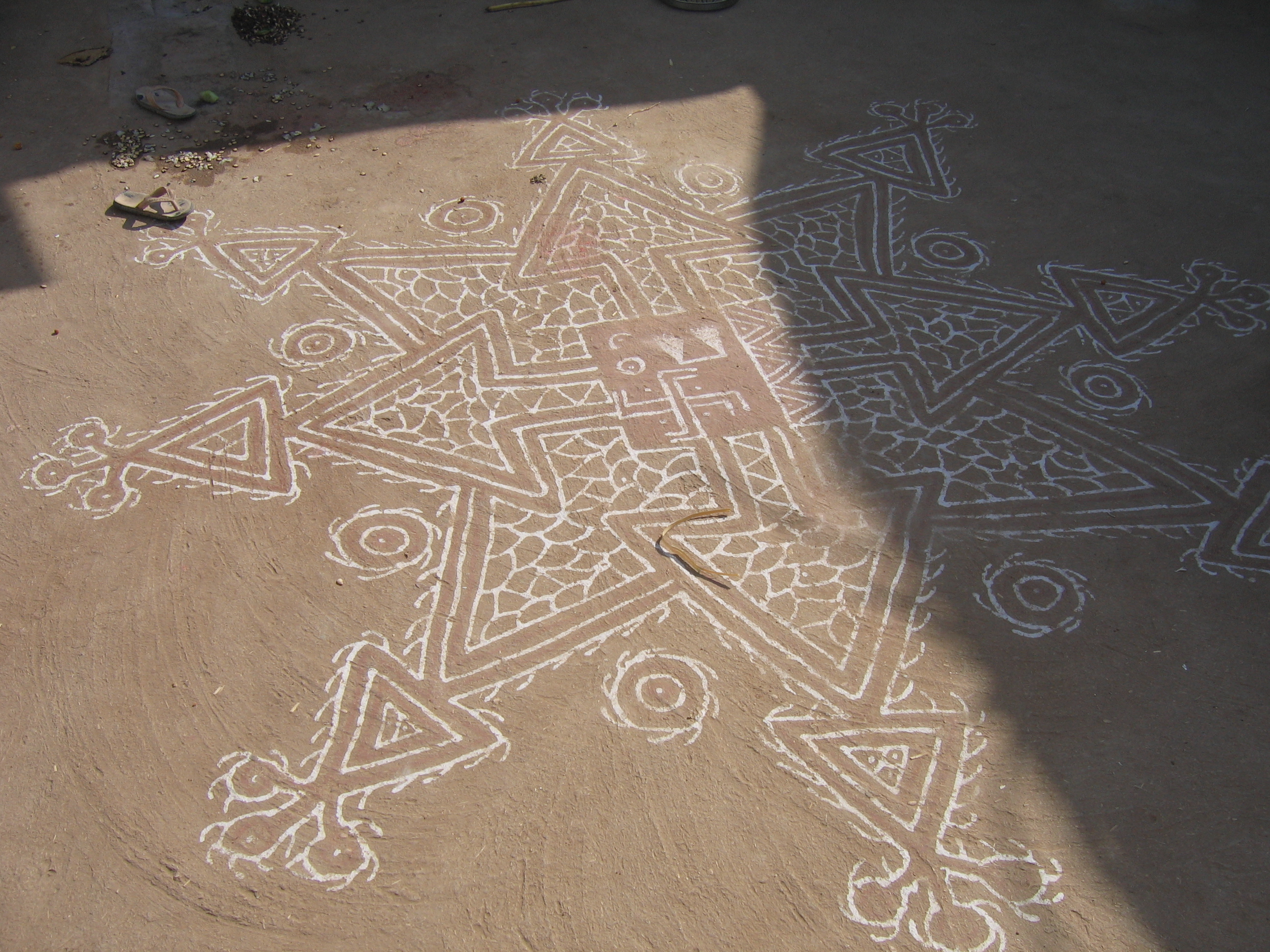 To celebrate Dussehra they had painted a Rangoli, a bit like a mandala, in white on the pressed ground that was their courtyard. The oldest child, a girl around twelve asked for shampoo but as Magan said we should not start a precedent, we gave them only sweets and they were very happy. Â He told us that they would tell the story of our visit for the rest of their lives, we would never forget them either, it was an encounter to cherish.